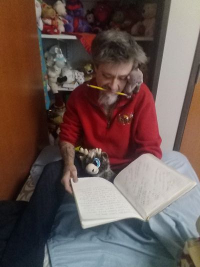 We were introduced to each other. By my friend Gypsy. Shy he was at first. Full of fear he was at first. Sensed I liked pan hop in, pop in frog legs. I would kid him about this. Do no harm to others. To put words not to hurt. Likes to look at my pencils an supplies. Between his legs I place. Back to my reference bible I go. To wanting to learn to read he go. A,B,C it go,to bible verse I go, to read in my write in he go. To read in my bible he go. To non stop he go. I watch an I watch. To sleep with he go. To wanting Jesus in his heart he go. I place my hand on your heart. You place your hand on my heart. Jesus is in your heart now ader. Closer to Jesus he become. Out winds he looks. From road to pond. Back over to me. I look down bible under his arm. In Jesus we are. Out winda I look.From road to pond to Reader to bible to frogs in a pond. Water in eyes to never let fall. I look down to bible, On The Road...